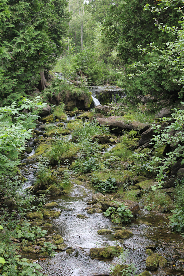 By the time the second image in Figure 7A was taken, Frame's Falls had, in fact, become quite overgrown with tree growth. (Consequently, I had to do some climbing through the foliage to take that picture!) A photograph like the top one of Figure 7A had become impossible to photograph. However, sometime in the first half of 2001, many of the spruce trees that crowded the view were scaled back and have been maintained since. Now the falls are clearly visible from Kribs Road, as is apparent in the third image of Figure 7A (and note the low summer water flow!). The view was virtually unchanged in 2023.