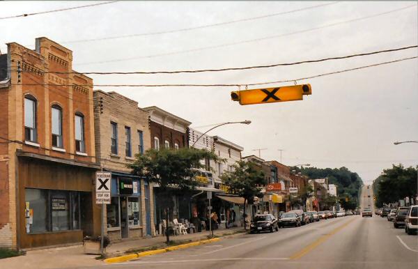 Figure W3C gives three images from a perspective looking more to the west, one from the late 1950s, another from 2004 and a third from 2022. The original Town Hall, built in 1889, is still visible at left in the top image. In the other two images, it has been replaced by its present incarnation, constructed in 1967 after the original Town Hall was gutted